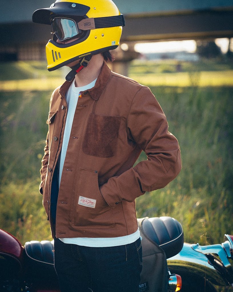 厚手コットンのワーキングジャケットに、ビンテージ感あふれるビクトリーグローブを組み合わせた、シンプルだけどクラシックバイク好きにはたまらないレトロスタイル。