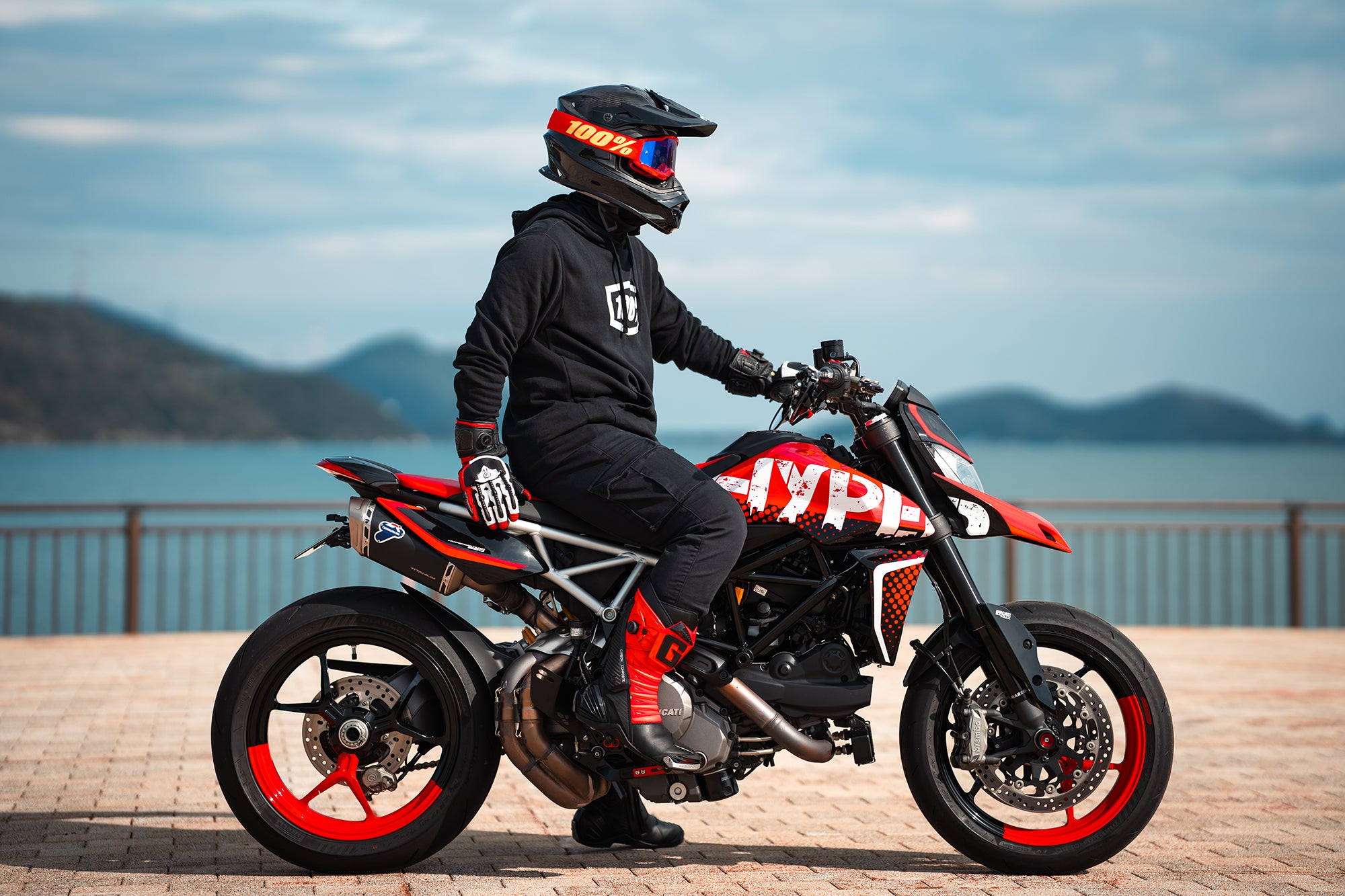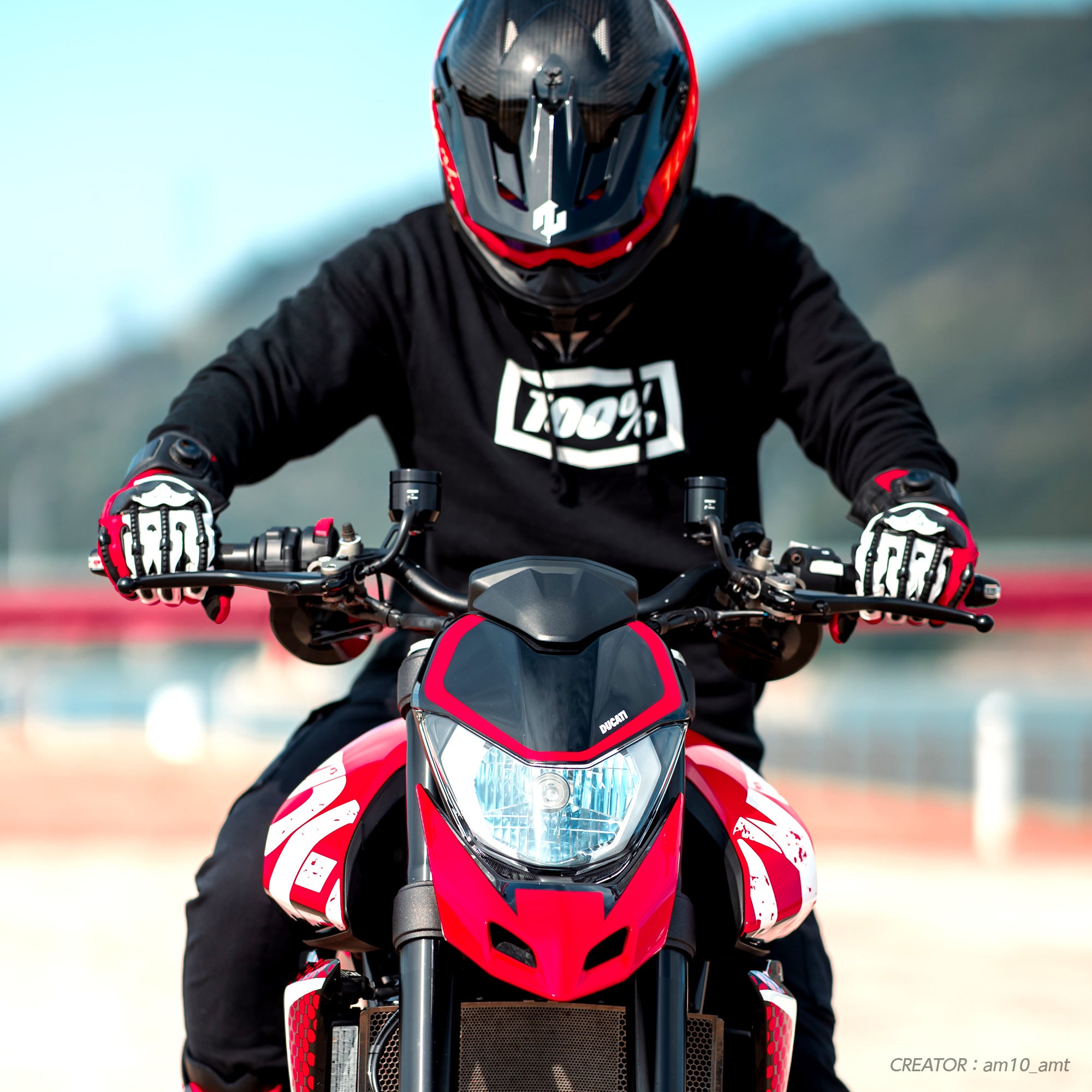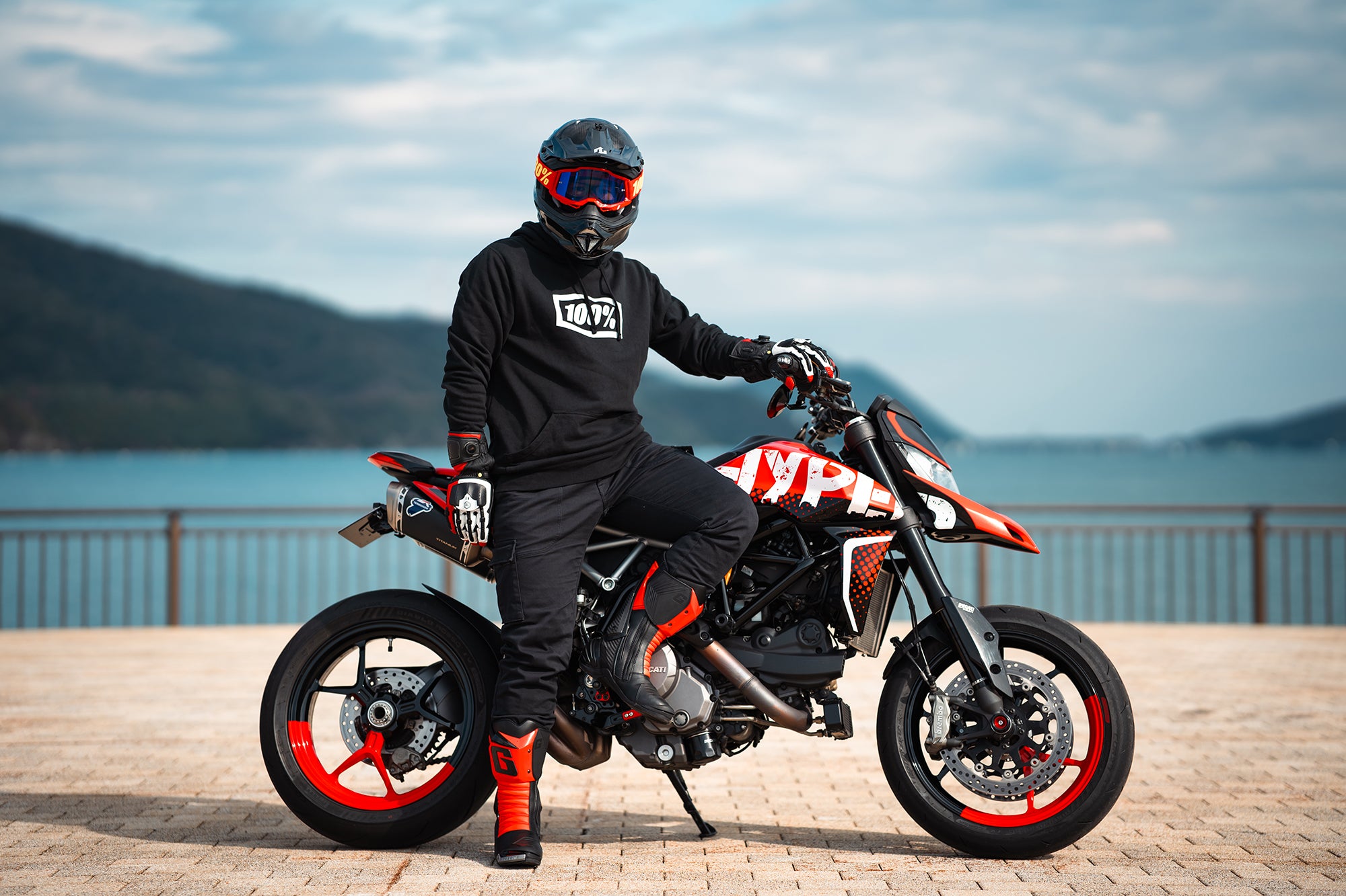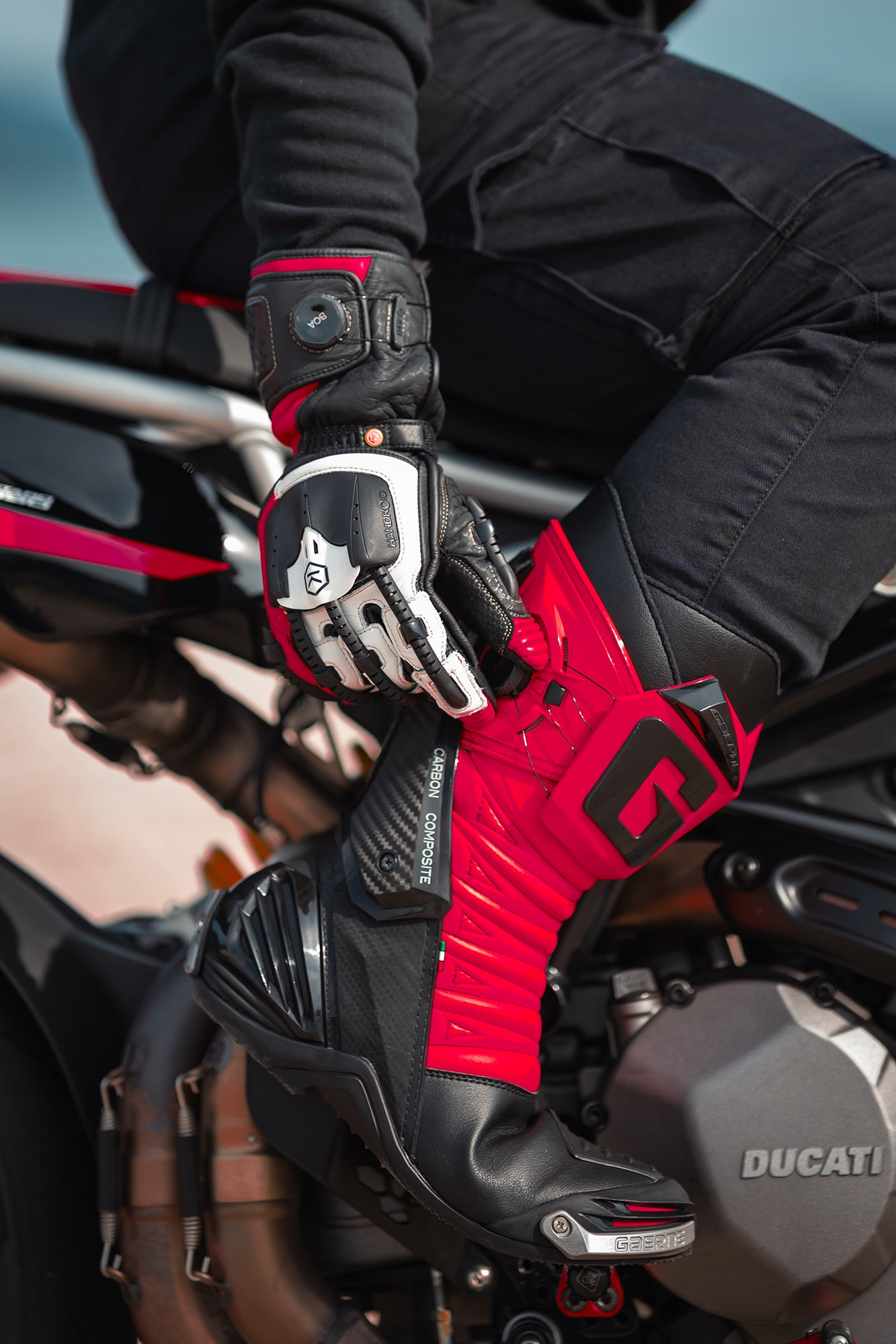 ブーツ、グローブ、そしてバイクのレッドがしっかりリンクして、統一感抜群。