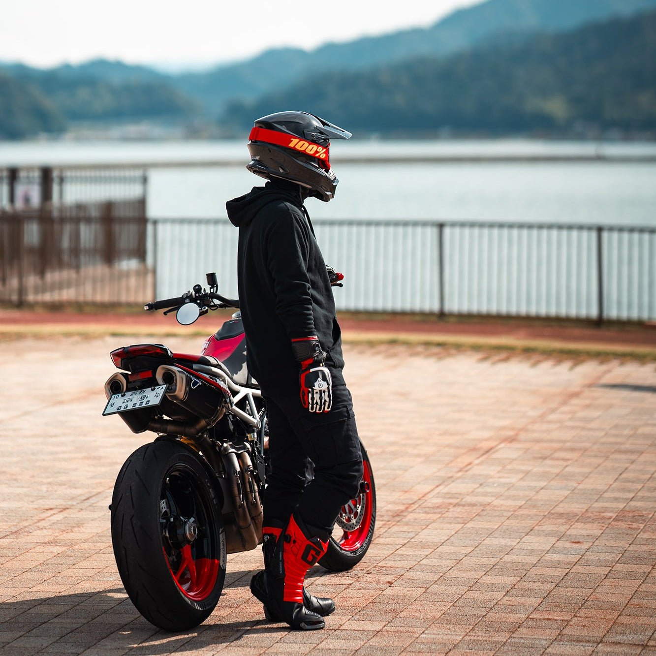 モノトーンのライダースタイルに、GP-1 EVO(ブラック×レッド)とKNOX ハンドロイド マーク5(レッド)がアクセントになったクールなコーデ。
