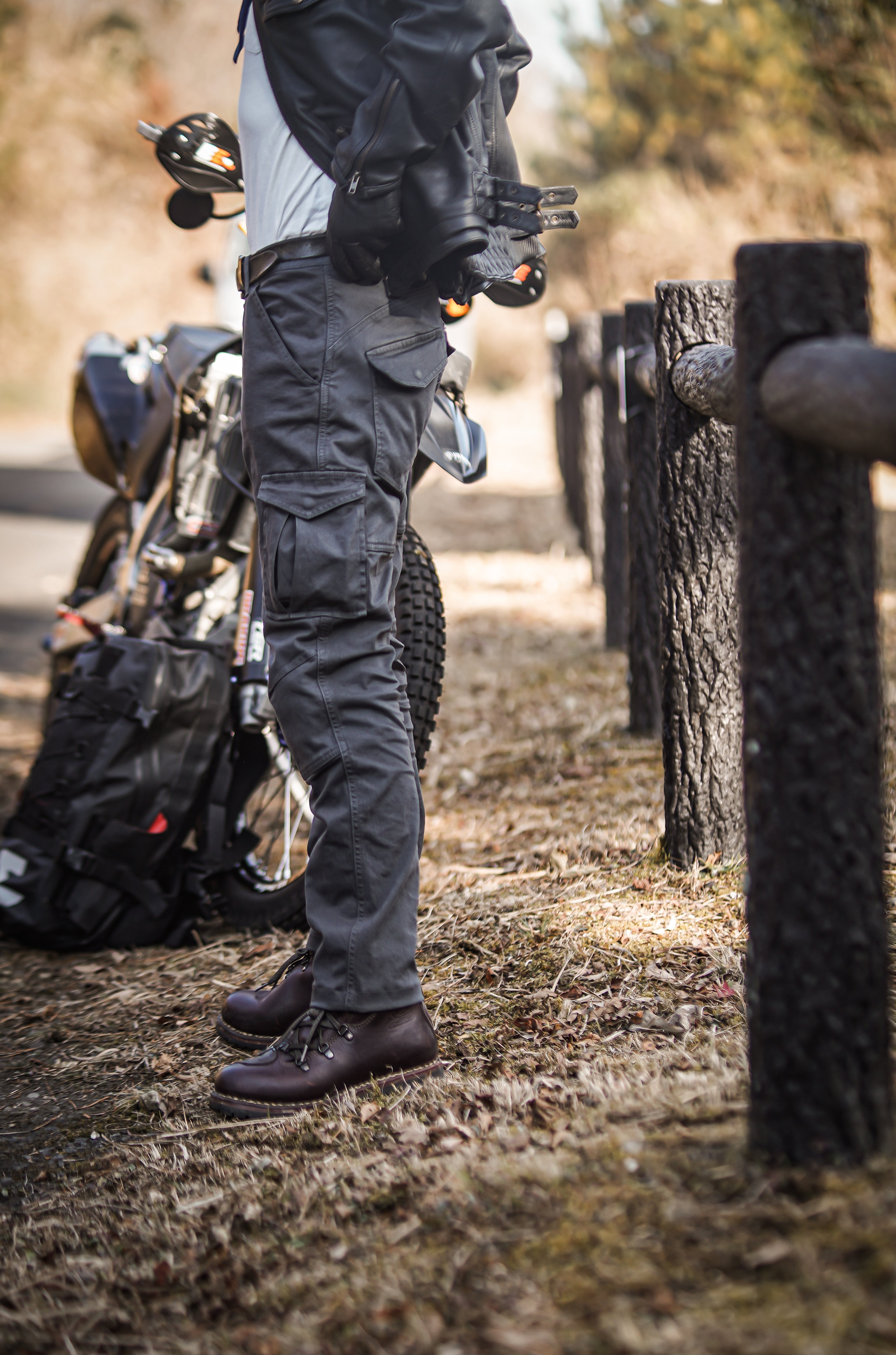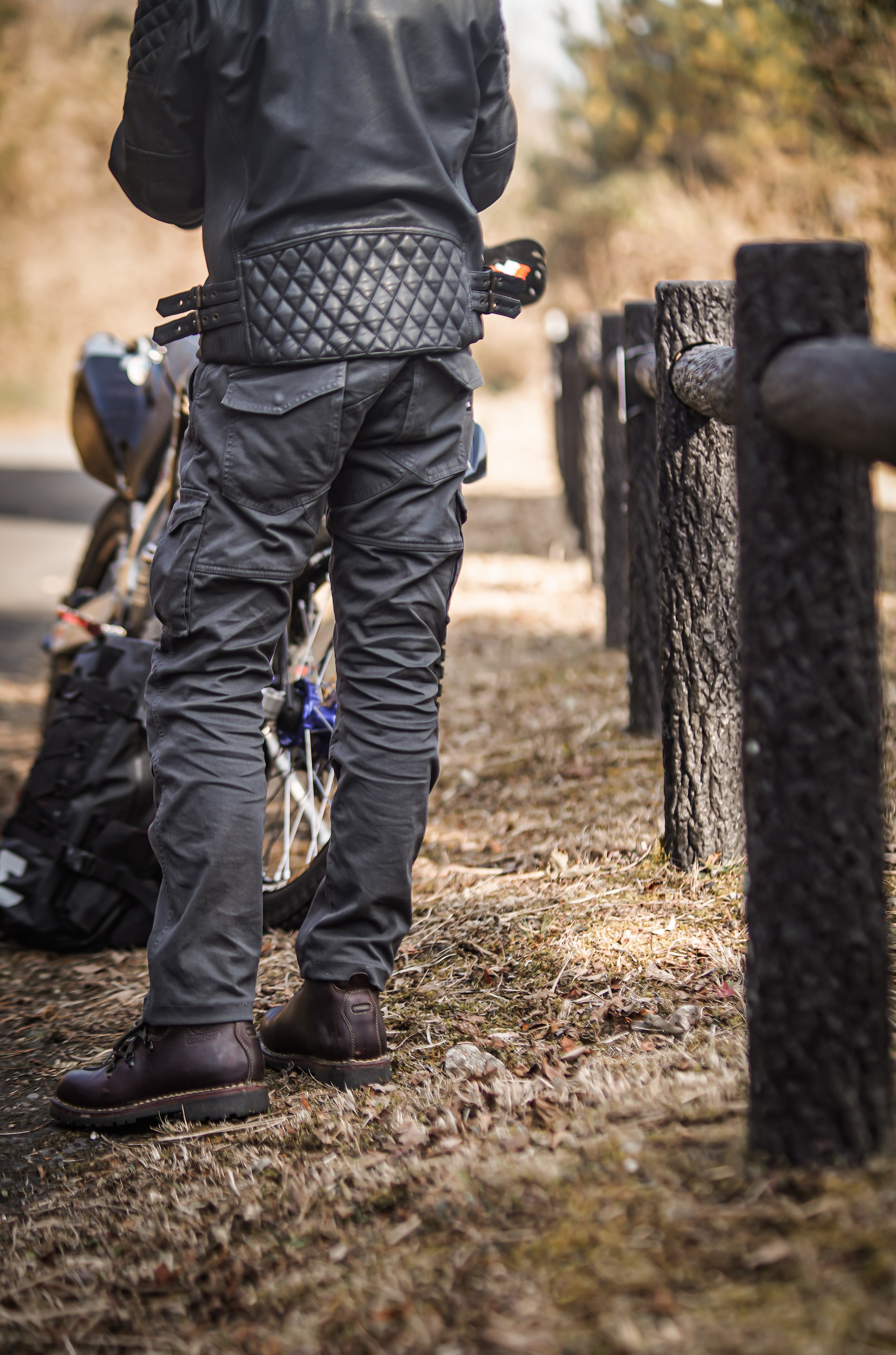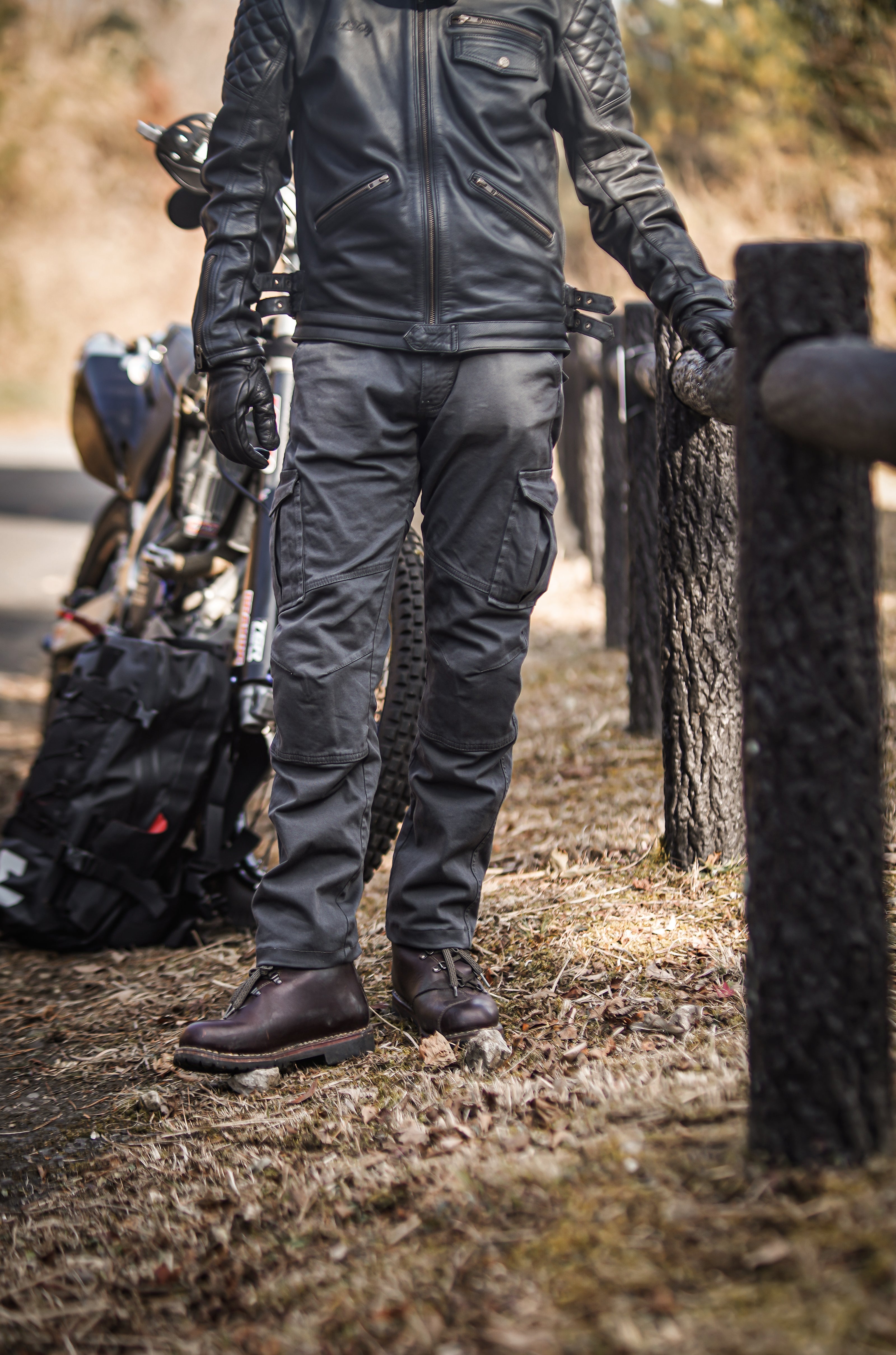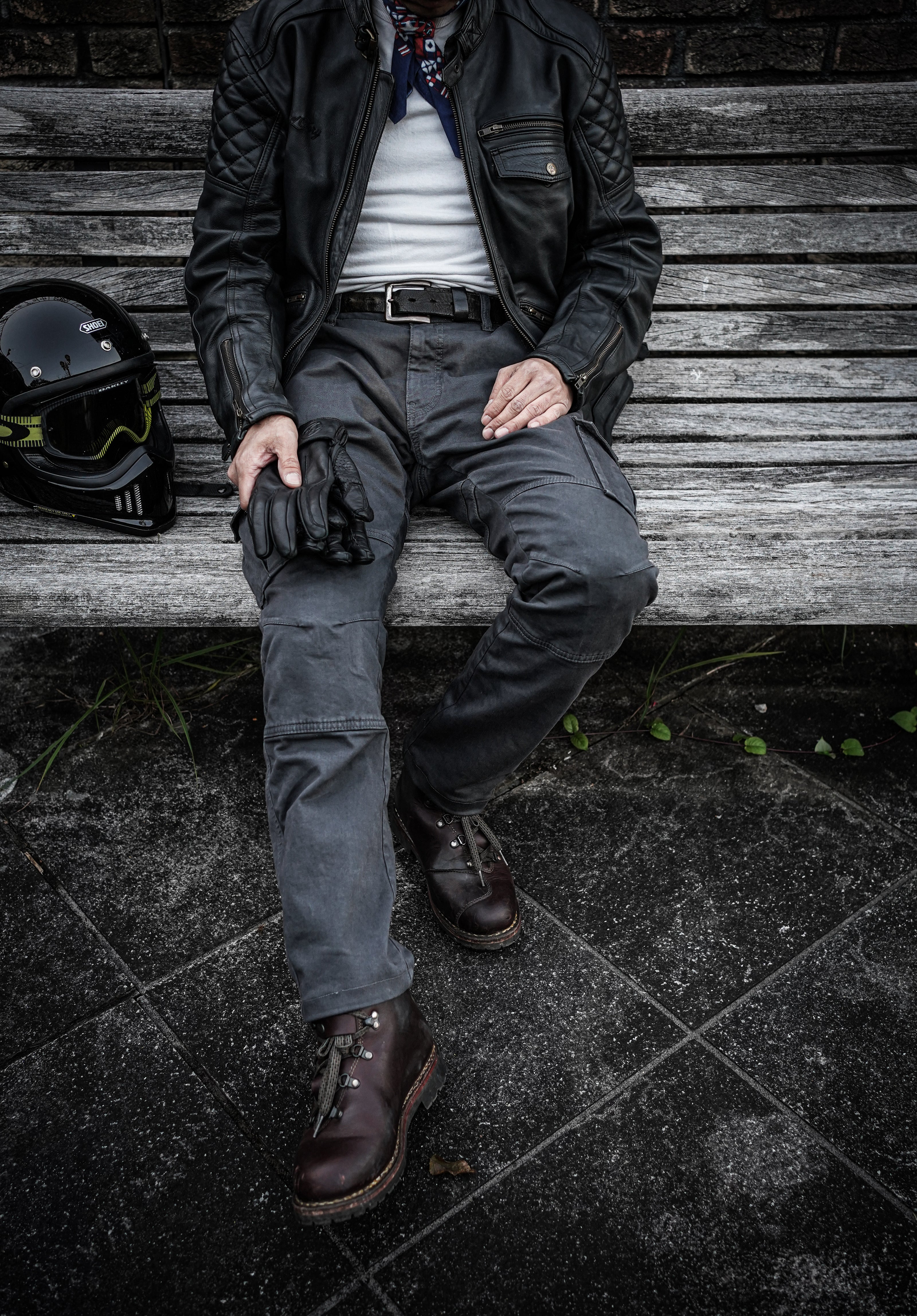 AGE OF GLORYのビンテージテイストのレザージャケットに、PMJのスリムフィットカーゴパンツを合わせた、落ち着きのあるライディングコーデ。