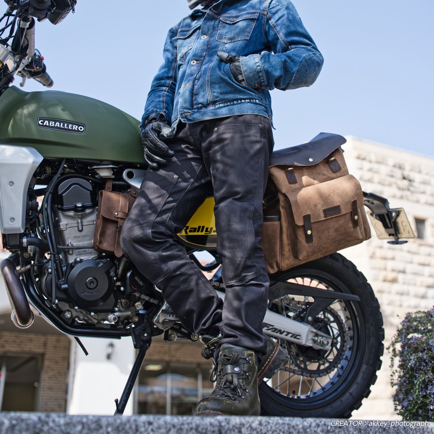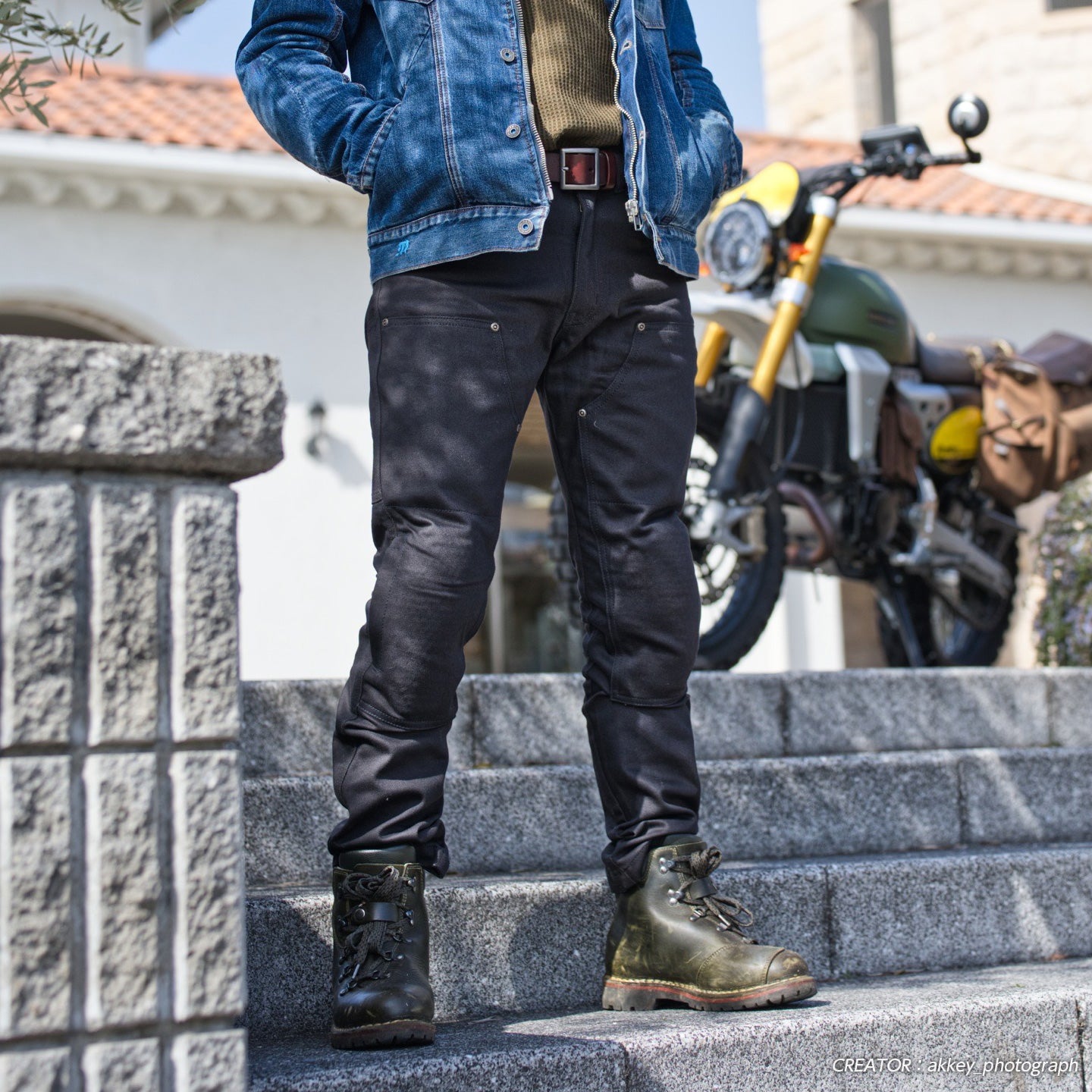 ガレージでも街でも、バイクでも映える、Age of Gloryらしい「ライダーの日常」に寄り添うパンツです。