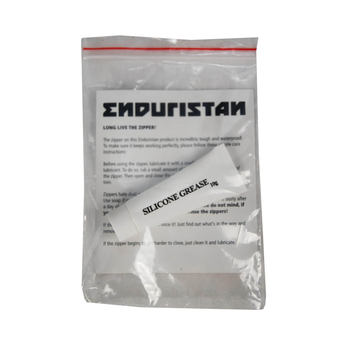 エンデュリスタン製品は、完全防水防塵防砂の機能を高めるため止水ファスナーのかみ合わせが非常に固く作られています。使い始める前に本グリスをファスナーに塗って開閉をスムーズにすることをおすすめします。