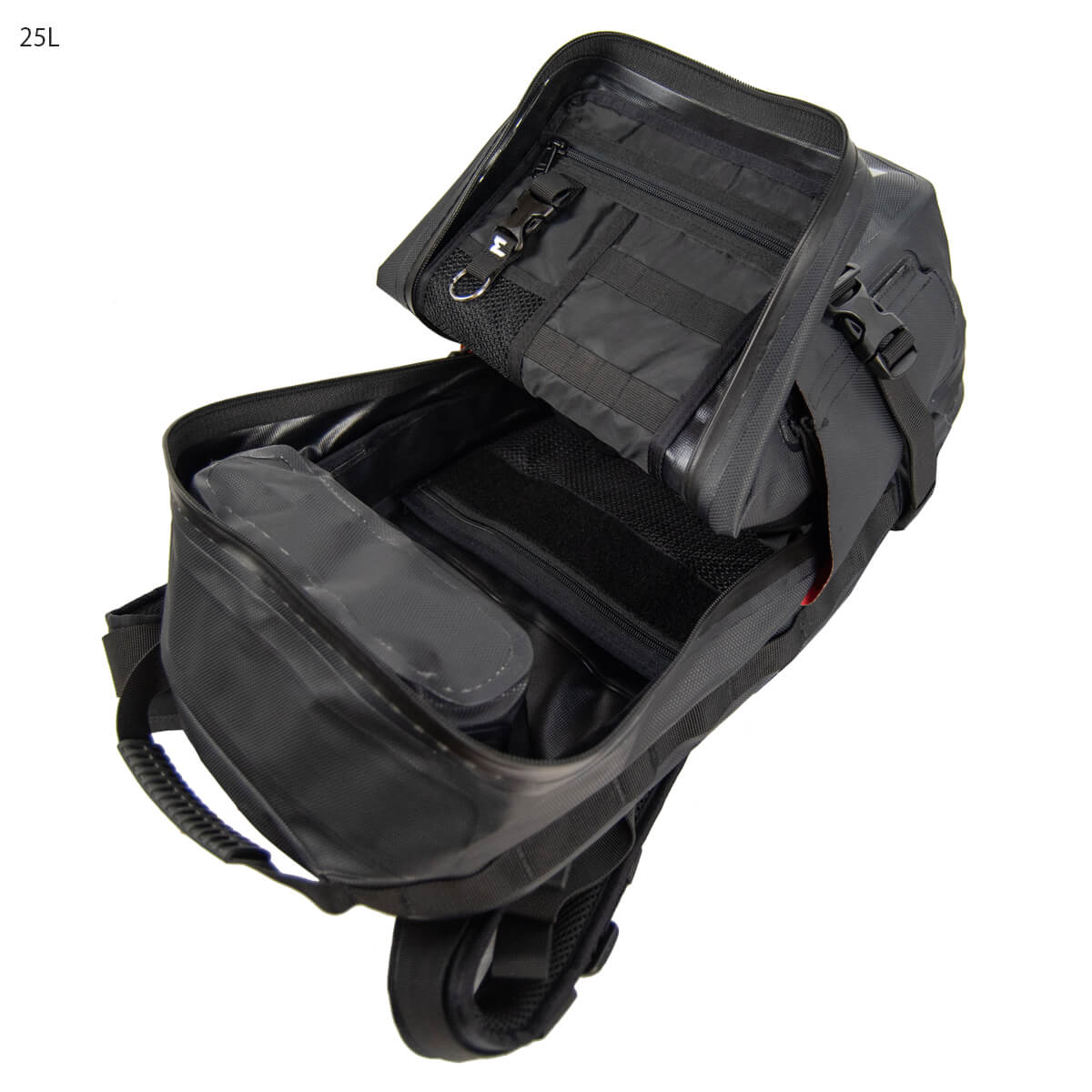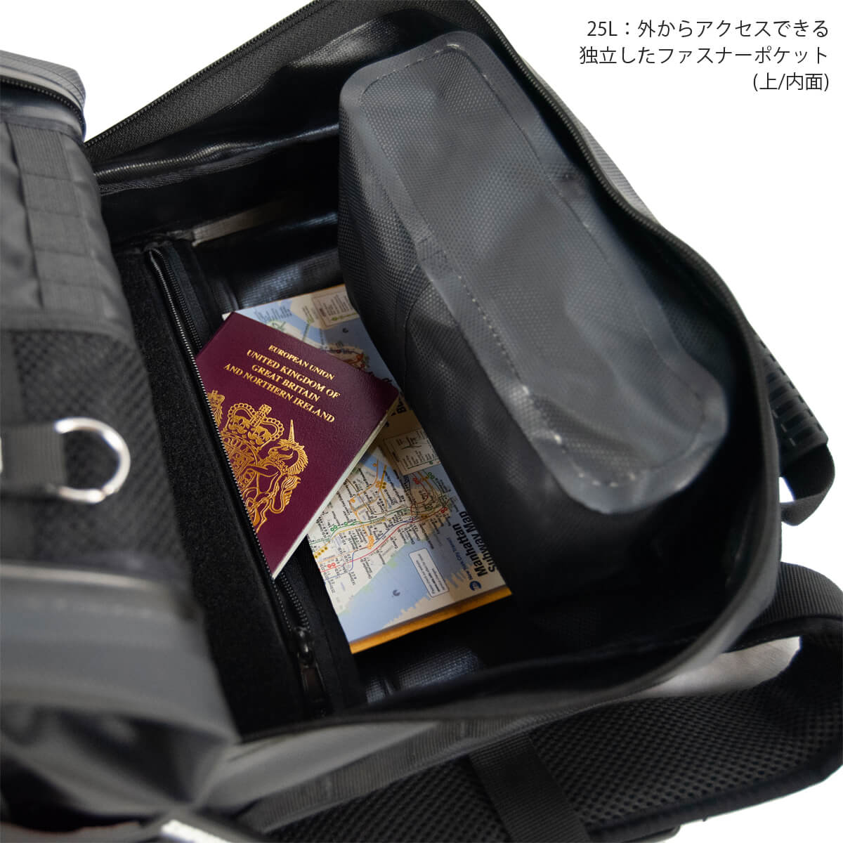 - 25Lにはメイン荷室に加え、外からアクセスできる独立した防水処理ポケットが上下に付いています