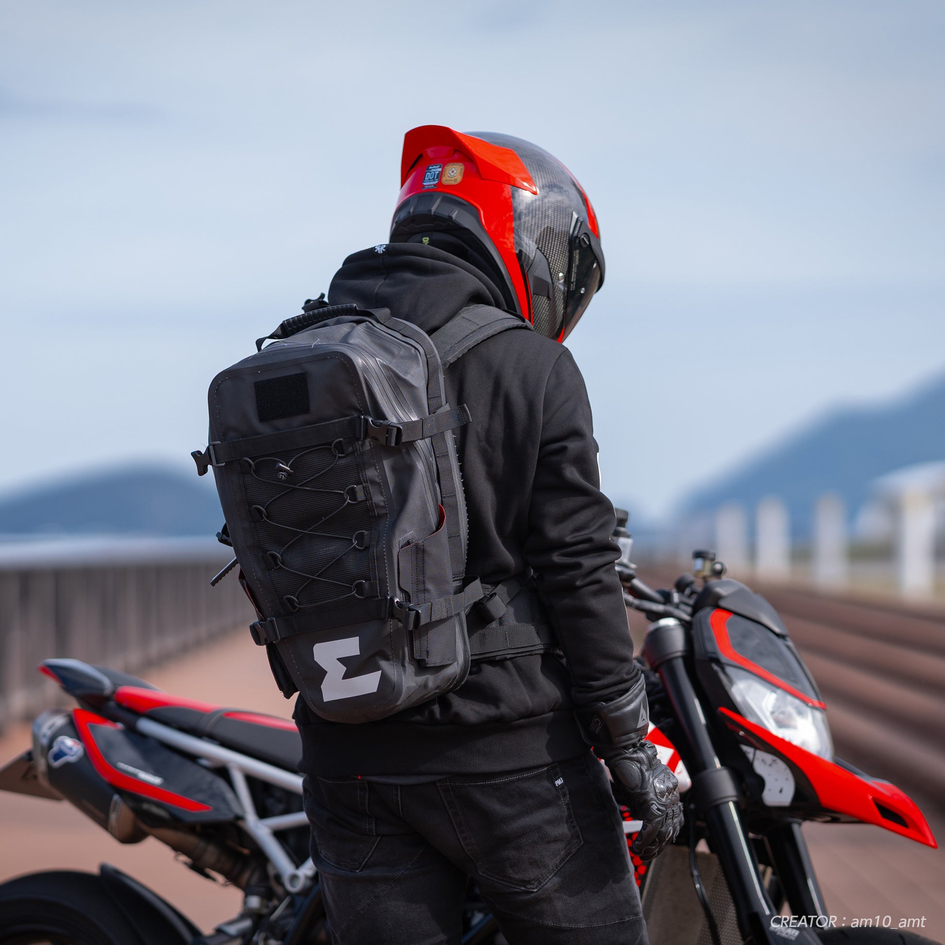 林道や泥だらけのオフロードライディングはもちろん、ワインディングを走るスポーツライディングやロングツーリングなど、バイクに荷物を積まずに背負って走ることができるためラゲッジよりも簡易的に使うことができ、かつ常に防水防塵してくれるので中身は安心です。使うシチュエーション、バイクの種類を限定せず、気軽に背負えてハードに使えるバックパックです。