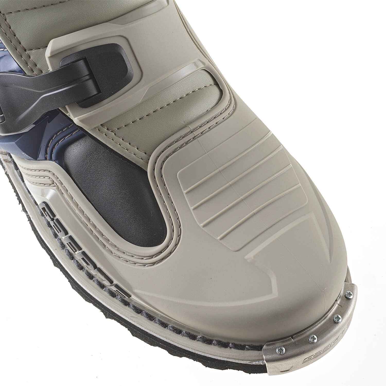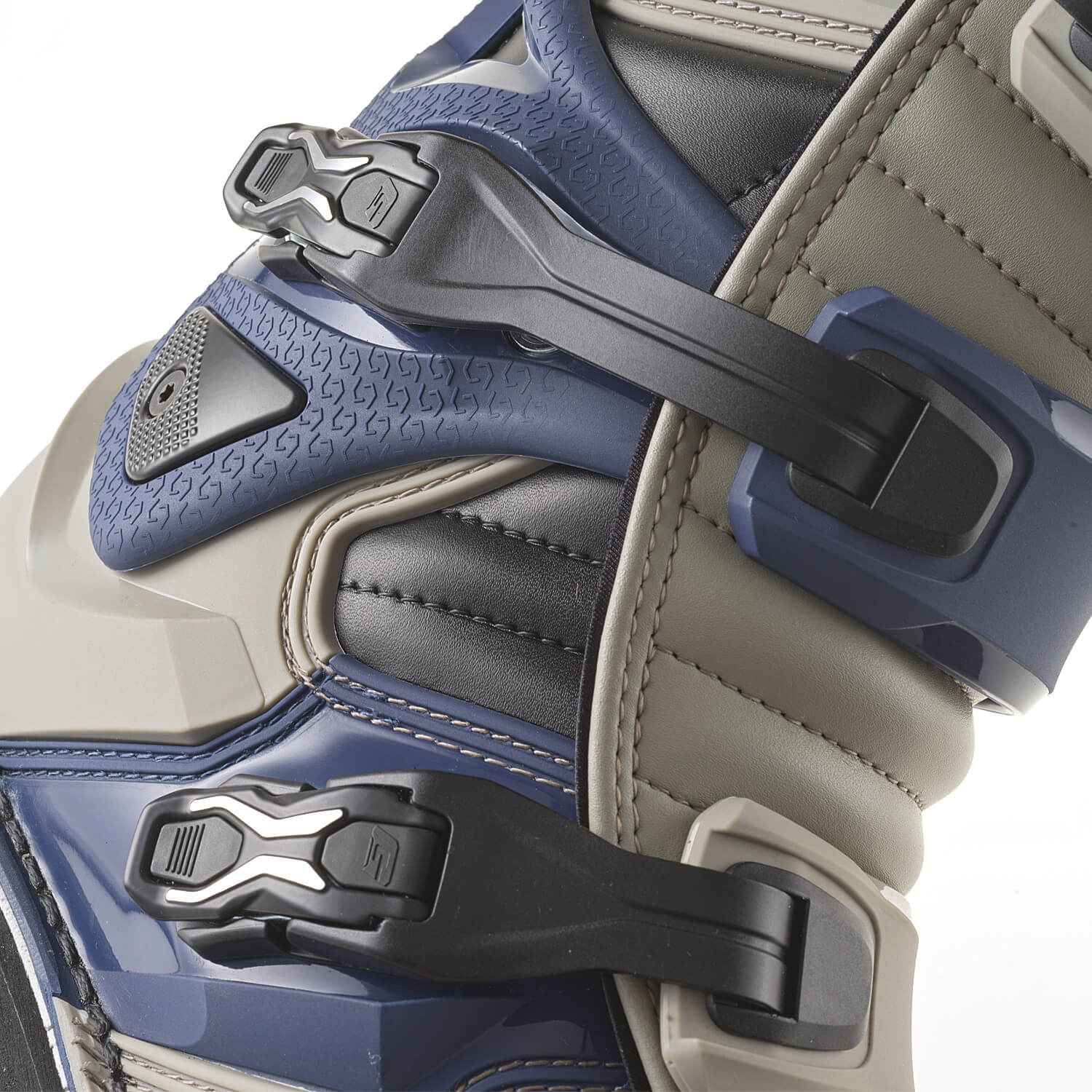 新しい仕上げを施した軽量アルミニウム製バックルを採用。トップバックルは、標準のストラップ調整に加え、3段階のポジション調整が可能。さらに、フロントシンガードも2種類のポジション調整ができ、ふくらはぎのサイズやニーガードとのフィット感を向上させます。