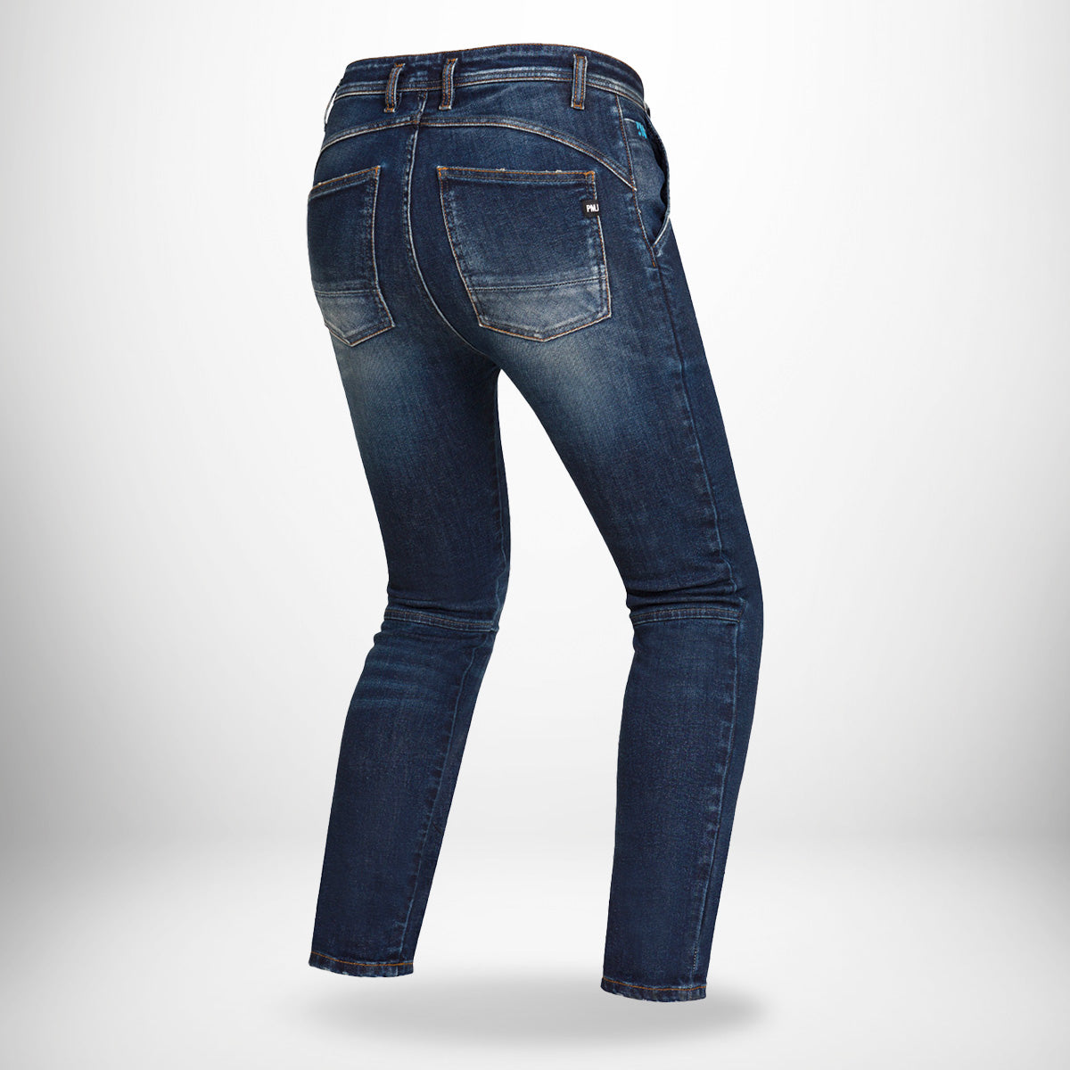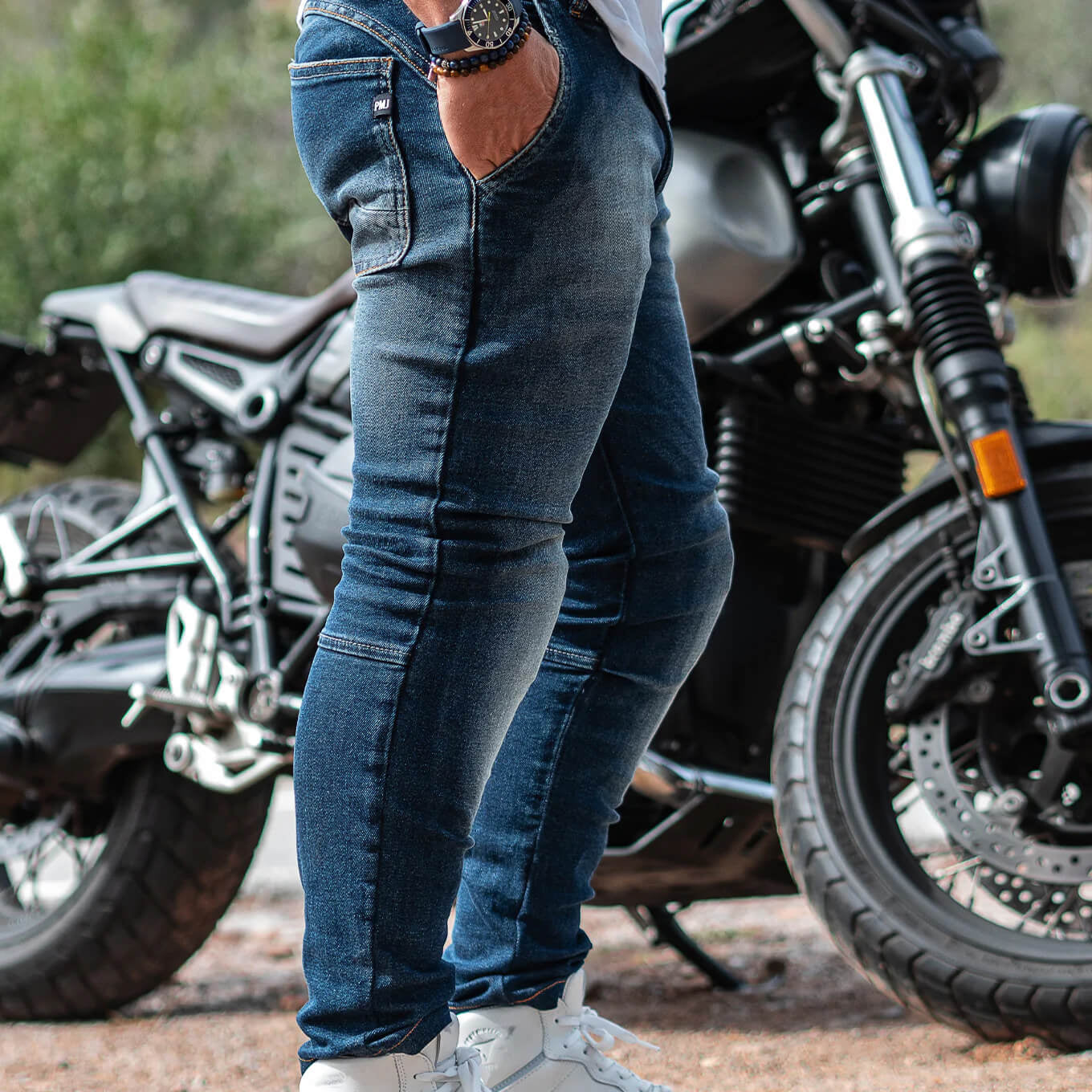 ラッセルは、PMJ独自開発の生地T-Stretch®を使用することにより、伸びのある柔らかい履き心地でありながら、摩耗や切り裂きに強いデニムパンツに仕上がっています。立体裁断による包み込むような形状で股上が深め。膝から下にかけてテーパードが効いていて、スキニー寄りのスリムで美しいシルエットです。フロントポケットは横から手を入れられるスラント型で、スッキリしています。ポケットや裾にさりげないダメージ加工が施されています。日帰りライディングから仕事場まで幅広いシチュエーションにマッチします。