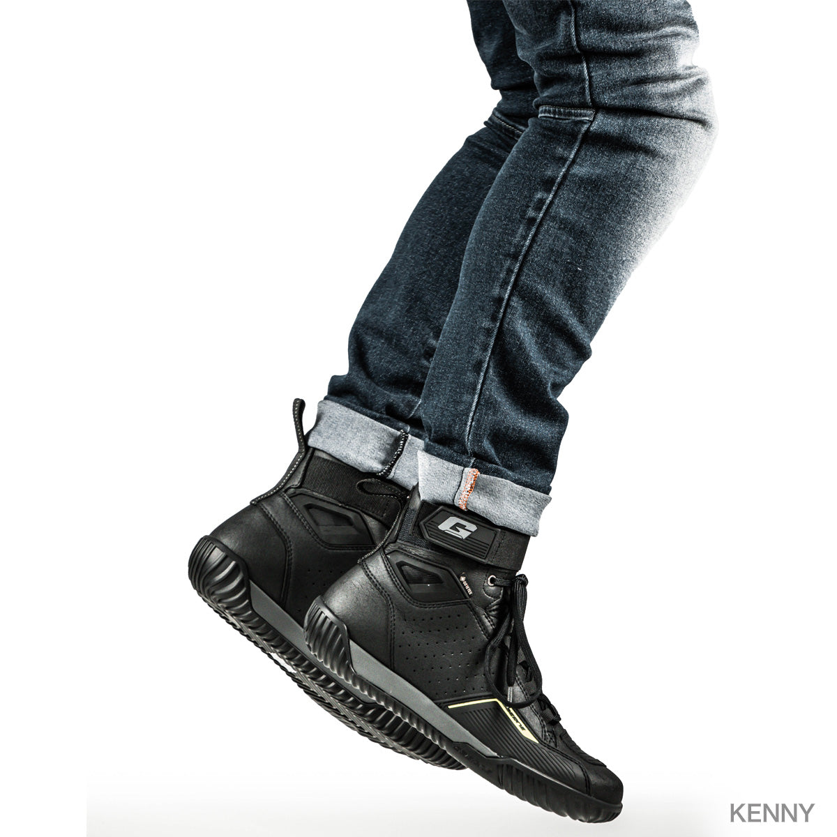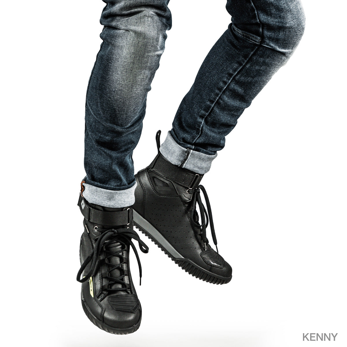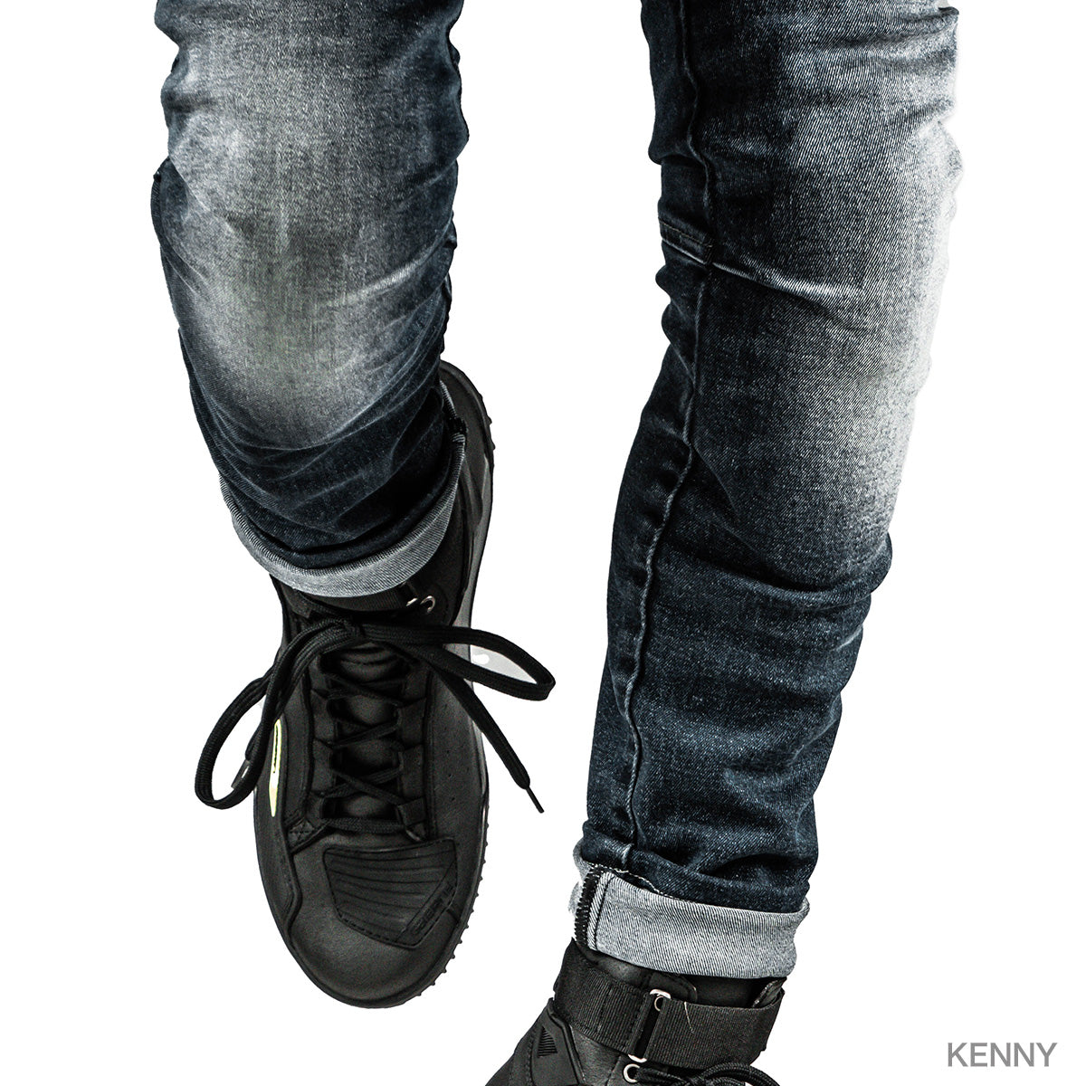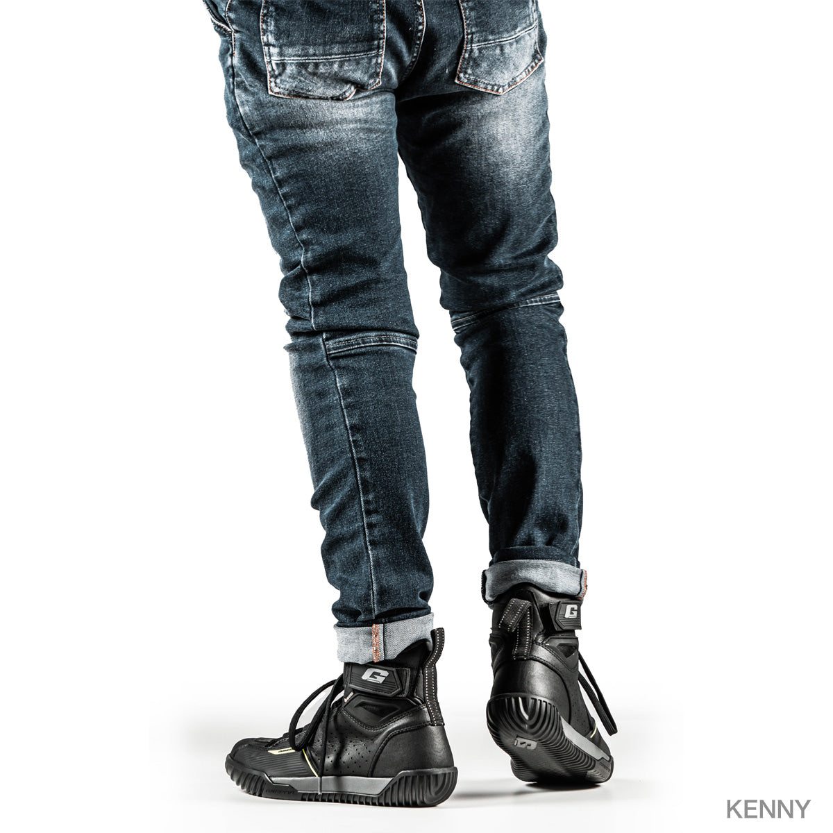 デニムの糸と防弾繊維TWARON® stretchの糸を織り交ぜたシングルレイヤー構造の生地。結束の強さ、摩耗・切り裂きへの耐久強度を持ちつつ、より軽く、通気性・ストレッチ性に長けた履き心地を実現。